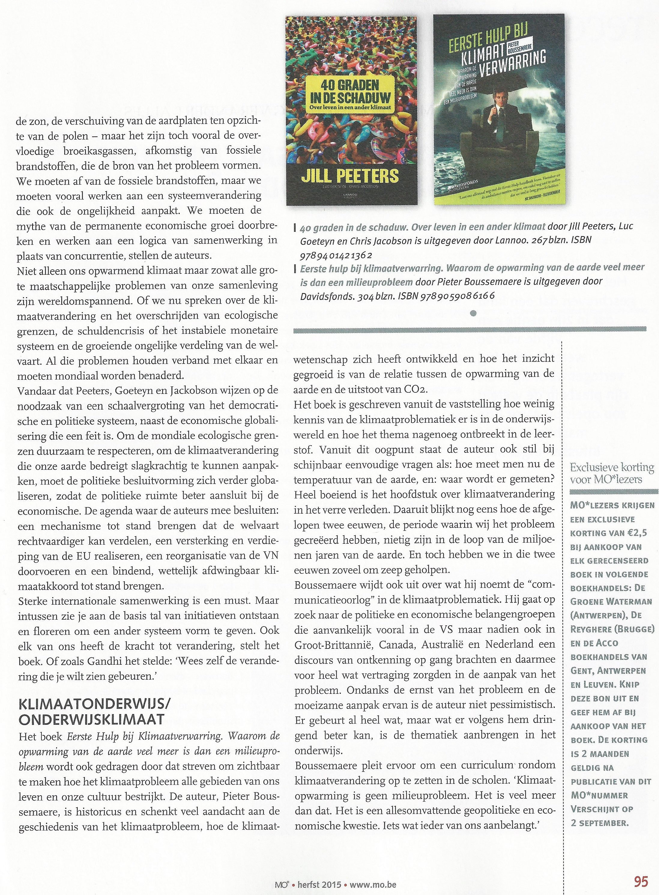 Het boek van Pieter Boussemaere biedt een uitgebreid overzicht over wat we weten, de geschiedenis ervan en de bijbehorende onzekerheden. Alles komt voorbij; van temperatuurmetingen en Tyndall tot onze klimaattoekomst, van Keeling tot klimaatontkenners. Het vlot geschreven en mooi geïllustreerde boek is een goede ingang voor mensen die nog onbekend zijn met klimaatopwarming en kan zeker als ‘eerste hulp’ klimaatboek dienen. ‘Klimaatopwarming’ is een term die in het boek veelvuldig wordt gehanteerd, omdat het volgens de schrijver “..de meeste accurate en beknopte omschrijving is voor wat ons te wachten staat..”. Inderdaad.